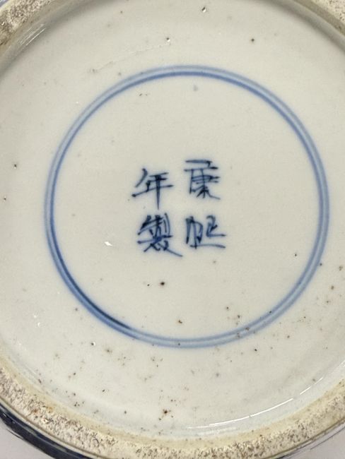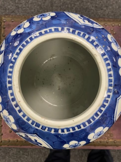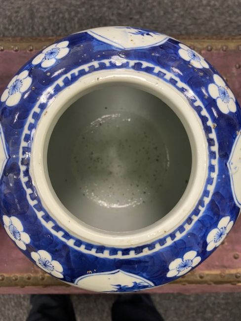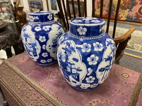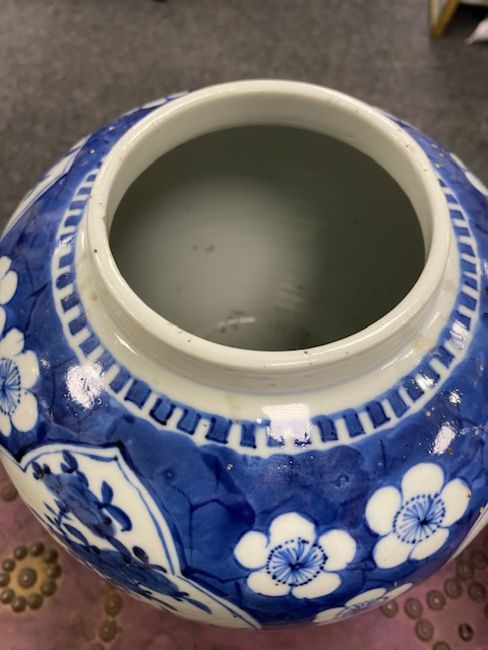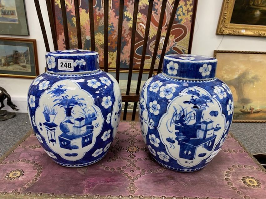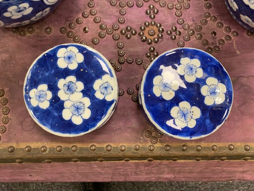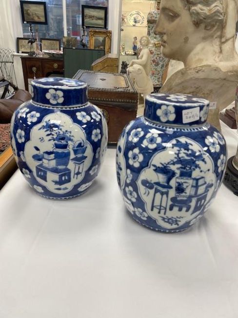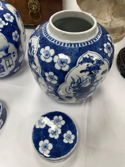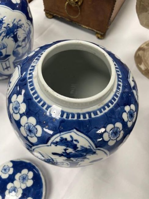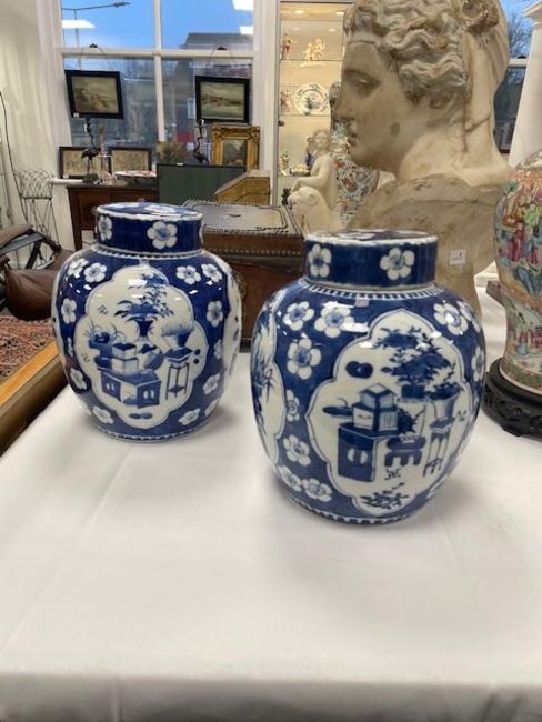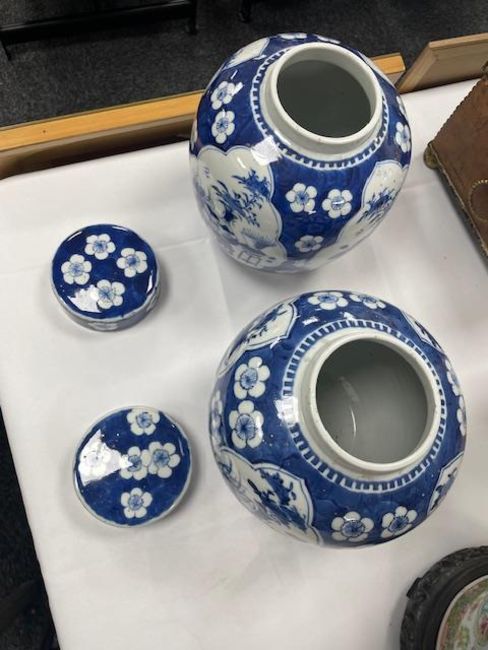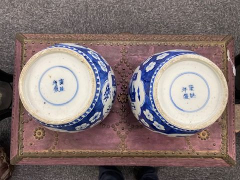 decorated with shaped reserves containing precious objects against a cracked ice and prunus ground, four character Kangxi but not of the period within concentric double rings, (2)