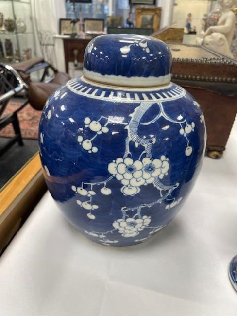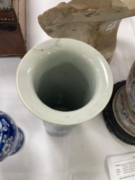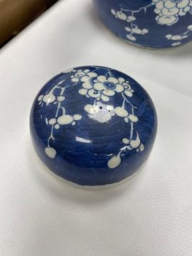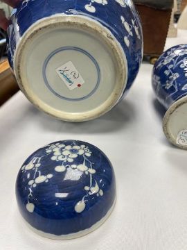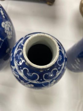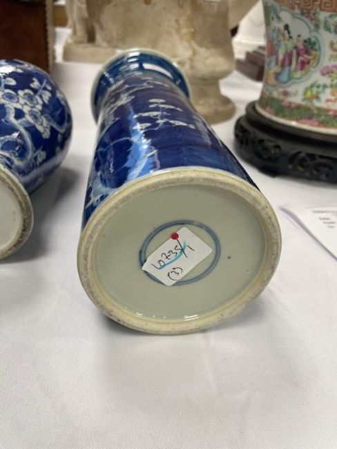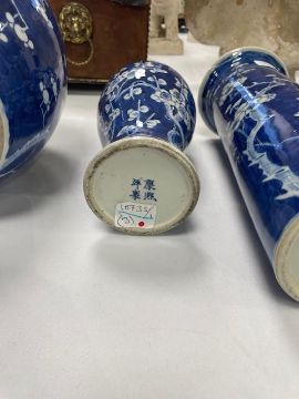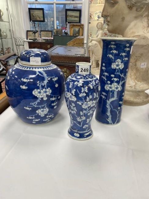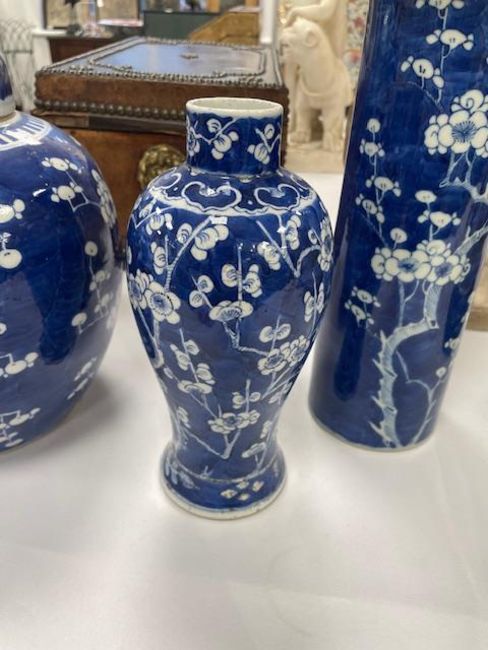 Condition: ginger jar in good condition without chips or hairlines. Baluster vase with hairline to rim and sleeve vase with repaired chip to flared rim