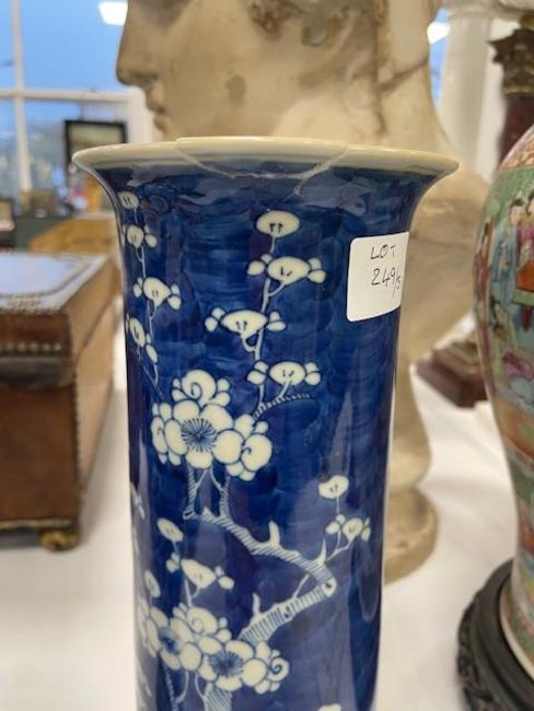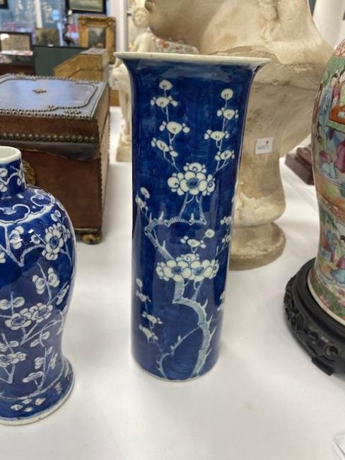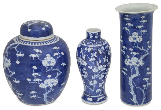 first decorated with flowering prunus against a cracked ice ground, double ring mark, together with a baluster vase with four character Kangxi mark and a sleeve vase with flared rim, double ring mark, (3)