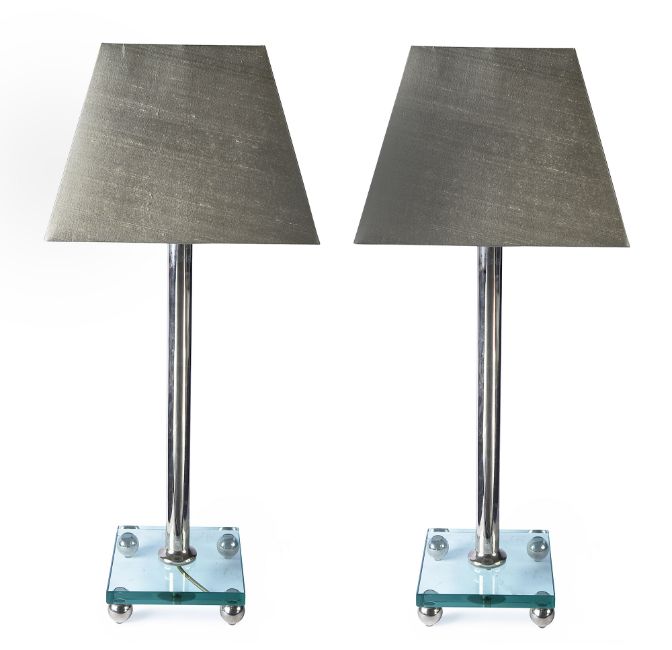 the chrome stems on square glass bases raised on chrome ball feet, fitted with grey silk shades stamped Porta Romana, (2)