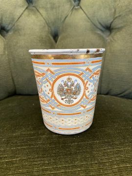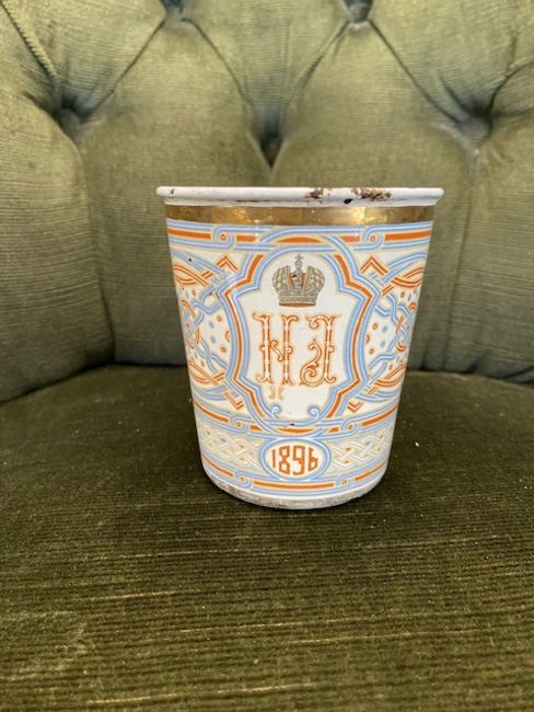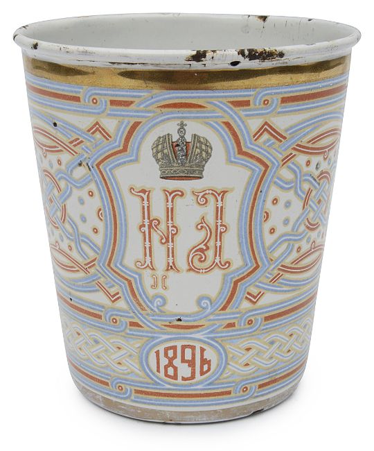 Provenance: Known as the 'Cup of Sorrows' due to its tragic association with the Khodynka Tragedy, where over 1000 people died during a stampede while attempting to collect these cups at the coronation festivities on Khodynka Field, Moscow. Supposedly the Tsar was much distressed by the this awful event and wanted to cancel the evening's celebratory ball, his advisors persuaded him not to do so, and as a result he became known as 'Bloody Nicholas'. This event in combination with the suppressed 1905 Bloody Sunday Revolt were amongst the keys causes of the 1917 Revolution.