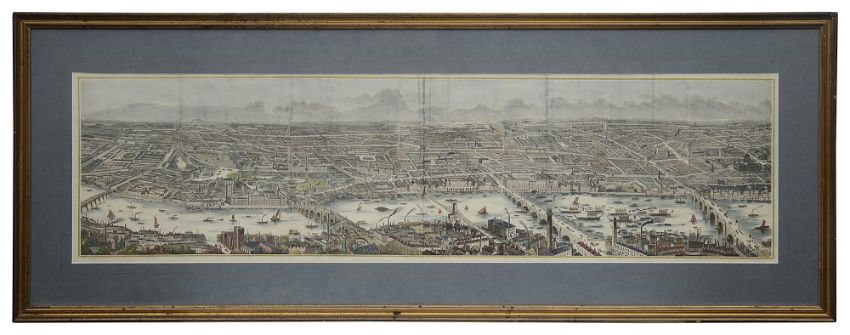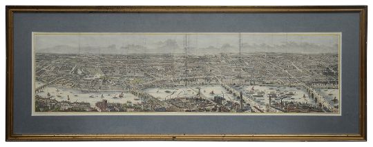 A Victorian panoramic view of London and the Thames coloured engraving, view taken from south looking north, printed in sections, with visible folds, within plain border, later mounted, framed and glazed