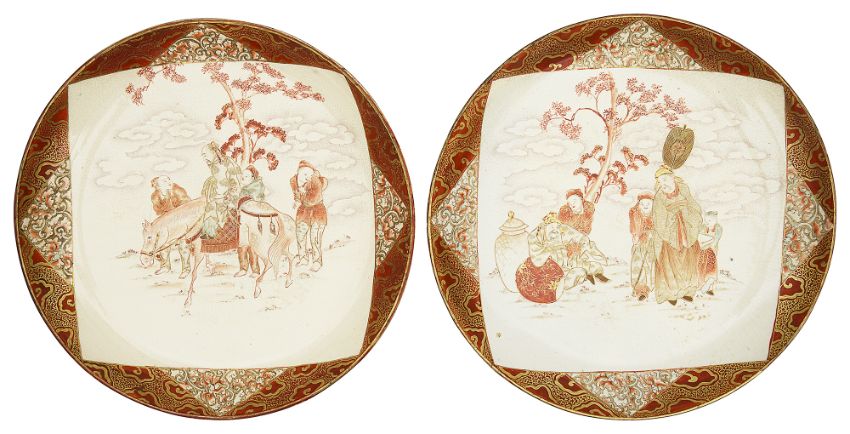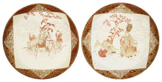 A pair of Japanese Kutani chargers, late Meiji period (1868-1912) each with central square panel, in iron red and gilt, decorated with figural landscape scenes, within elaborate borders, marks to bases (2)