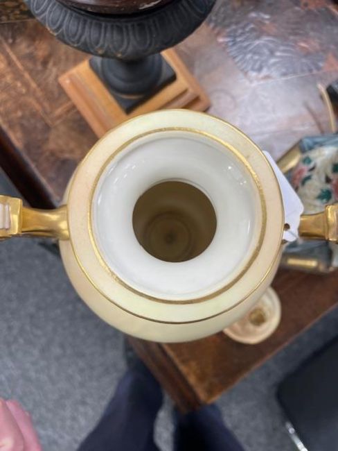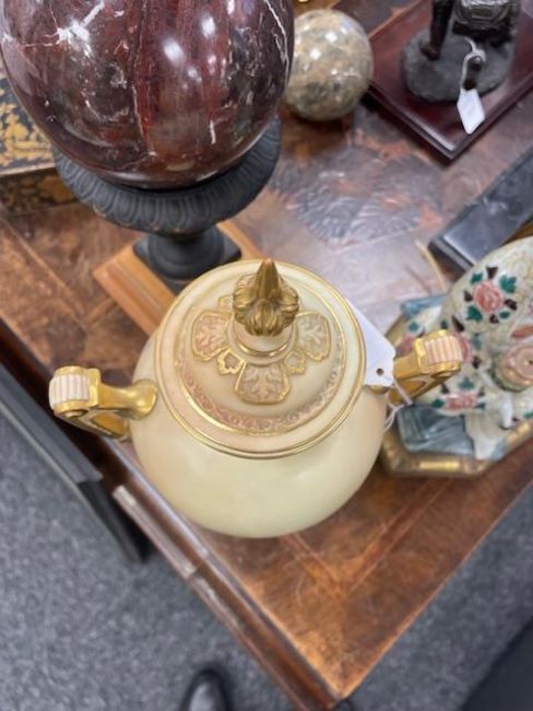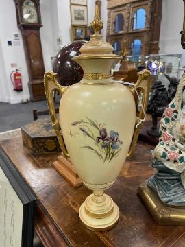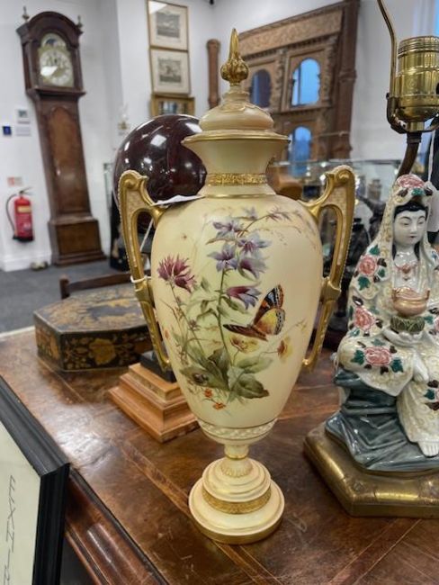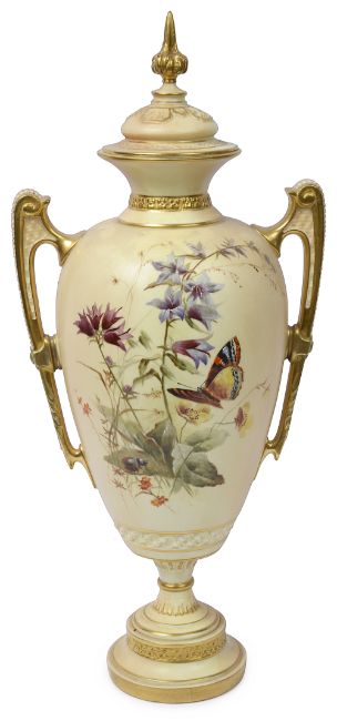 A Royal Worcester blush ground twin-handled vase and cover, c.1892, model '1481', domed cover with finial, body of elongated ovoid form, twin high scroll handles, footed base, decorated with flowers and butterfly, gilt embellished,