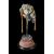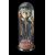 the dome containing a tall glass trumpet vase holding a bouquet of feather flowers, wax flower buds and two straw work exotic birds, raised on red velvet plinth, on an ebonised moulded base on feet