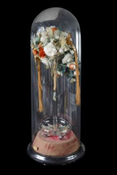 Condition: Good condition commensurate with age. No faults to dome. Some feather have fallen and become detached form bouquet. Some damage to beak of one bird. Overall bright Velvet plinth worn and faded