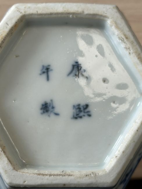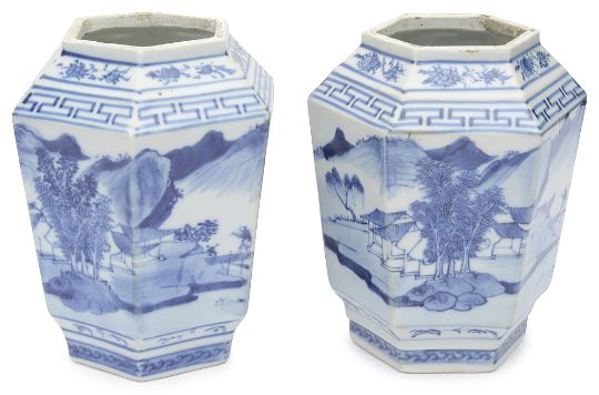 of hexagonal faceted tapering form, decorate with a continuous mountainous watery landscape with pavilions and a figure on a bridge, four character Kangxi mark but not of the period, (2)