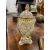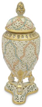 late 19th century, gilt embellished, the domed cover with finial, on tapered egg shape body, raised on three mask and scroll supports to trefoil base, marks to underside,