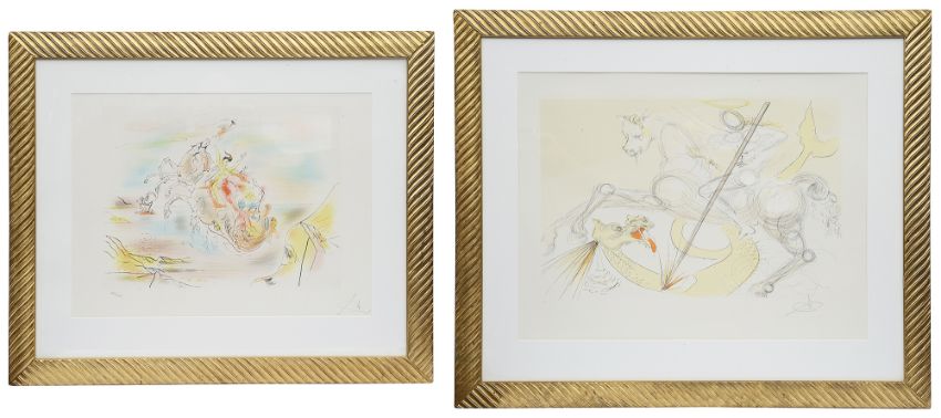 Salvador Dali (1904-1989) St George and the Dragon, 1974, colour drypoint etching on paper, pencil signed (lower-right), framed and glazed; together with 'Homere', 1985, colour etching, pencil signed (lower-right), numbered 186/250, printed by Atelier Martinez, certificate verso, framed and glazed (2)
