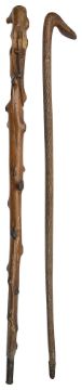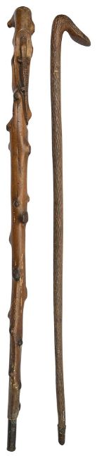 first, a holly stick carved with crocodile and a frog motif the other carved a snake, the head forming the handle, (2)
