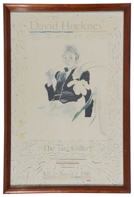 David Hockney (British, b.1937) 'Travels with Pen, Pencil and Ink' Tate Gallery Posteroffset lithograph on wove paper, unsigned, 1980, framed and glazed The poster reproduces Hockney's crayon drawing 'Celia in a Black Dress with White Flowers' 1972within frame 75 x 49.5cm., overall 81.5 x 56cm.Condition: Fair condition, commensurate with age, obvious colour fading to poster,significantly less vibrant than original, stains along the bottom, unexamined out of frameEric Shanes: '...Hockney created a pictorial frame around the reproduction of a drawing by Celia Birtwell, and played a characteristic game by adding stressed to the lettering, even underlining the word 'free' to emphasise the accessible nature of the show.'Provenance: poster created for Hockney's exhibition 'Travels with Pen, Pencil and Ink' held at the Tate Gallery, London, July 2nd - August 3rd 1980. Eric Shanes writes of this poster in his foreward essay for 'Hockney Posters' (1987), 'For an exhibition of drawings and prints entitled 'Travels with Pen, Pencil and Ink', held at the Tate Gallery in 1980...'