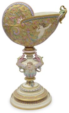 Condition: Hairline crack visible to underside of base, running from centre towards rim for 4 cms. The nautilus shell has been knocked off from stem and restored