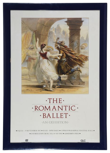 A GLC Royal Festival Hall Poster, 'The Romantic Ballet'lithographic poster, 1985, framed and glazed within frame 75 x 49.5cm., overall 83 x 58cm.Condition: Good condition, commensurate with age, unexamined out of frame Provenance: The Estate of Tom Merrifield (Australian, 1932-2021)The Romantic Ballet, An Exhibition, 19 July - 8 September 1985, GLC Working for the Arts in London