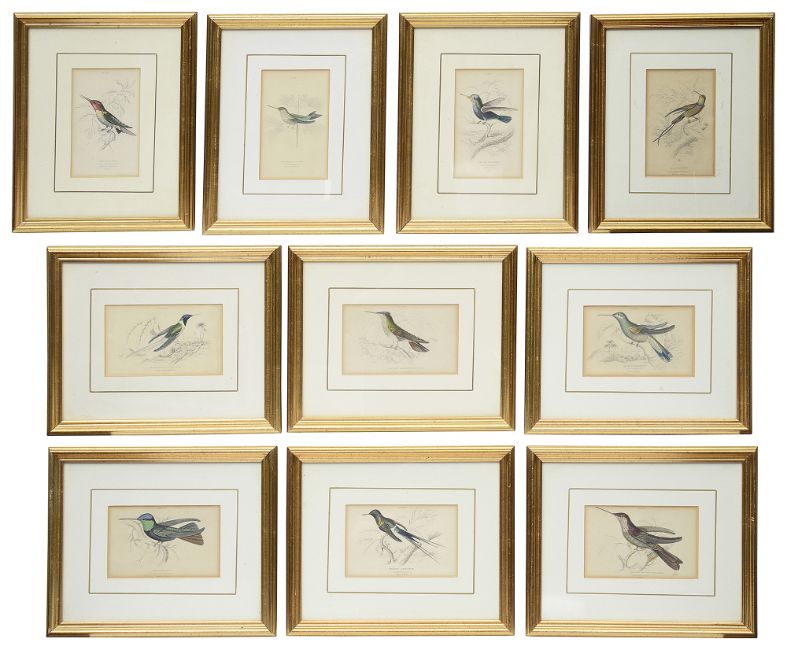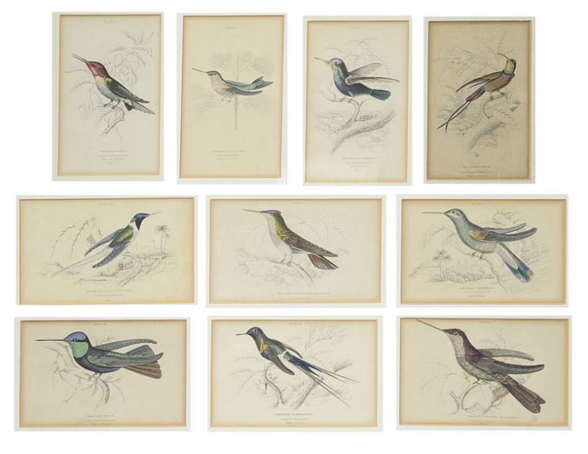 After Lizars, William Home (1788-1859) A set of ten handcoloured hummingbird bookplate engravings, numbered and titled, from Jardine's Naturalist's Library- Family of Trochilidae or Humminbirds, first published c.1854, London, later mounted, framed and glazed (10)