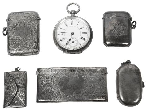 first Chester, 1911, Albert Ernest Jenkins, foliate engraved with suspension ring, together with a plain oval double sovereign case, a foliate engraved curved hip card case, two vesta cases, one foliate engraved the other plain engraved with initials and an open faced lever pocket watch, (6)