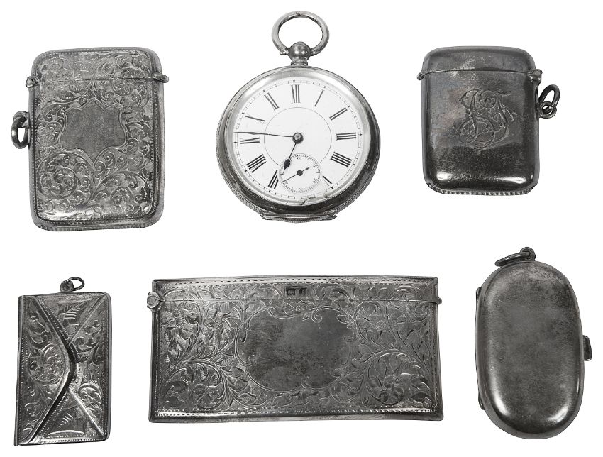 Condition: Good condition commensurate with age. All closes with snap except card case but not snugly. Chip to glass of pocket watch. No guarantee can be offered as to the full working order