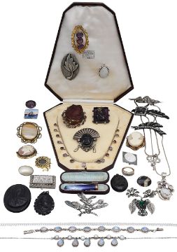 to include a 9ct five stone emerald and diamond ring, an amethyst and garnet silver fringe necklace in associated case, a Norwegian silver-gilt and painted enamel panel brooch decorated with a Viking longship at sea by, a Victorian gilt metal and enamel In Memory locket brooch, Victorian silver locket brooch, Charles Horner purple paste brooch, Blue John oval panel brooch, a Mexican black onyx and silver mask brooch, a carved jet cameo portrait pendant, a purple glass cameo portrait brooch