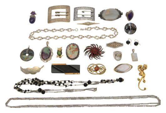 to include a large silver-gilt and foliate engraved buckle brooch, an American small similar silver example by William B Kerr & Co, a banded agate brooch and a pair of banded agate bead ear pendants with hook fittings, (test as gold), silver knot link chain necklace, banded agate panel bracelet, labradorite disc pendant, a fancy link long guard chain, a quartz ring, (qty)