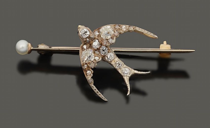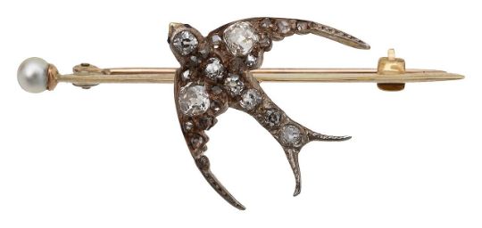 A mid Victorian diamond-set and pearl swallow bar broochthe old-cut diamond-set swallow in flight with ruby eyes mounted in silver and yellow gold and applied to the knife edge bar, with a pearl (untested) to one endwidth 4.6cm, 4.0gCondition: Mainly bright diamonds, especially the old brilliant-cutsPossible repair to middle of the tail section