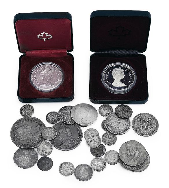 to include William III crown 1696, Queen Anne shilling 1711 George II shilling 1723, Victoria double florin 1889 together with a small collection of pre 1920 silver coins mostly 3d's, cased Canada Elizabeth II silver proof one dollars, 1980 and 1987, some post 1920 and pre 1947 coins , (qty)