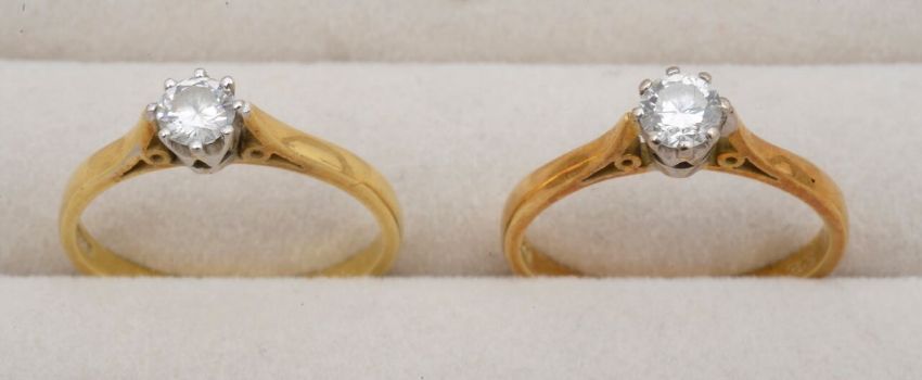 with 18ct hallmark, diamond solitaire with .35 stamp to band and a 18ct hallmark, diamond solitaire with .25 stamp to band.(2)