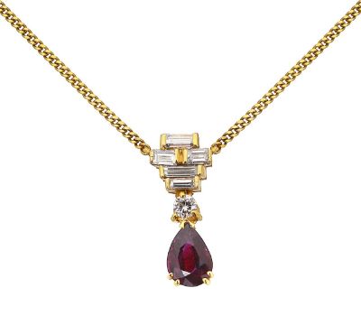 A ruby drop and diamond baguette necklace in 18ct yellow gold