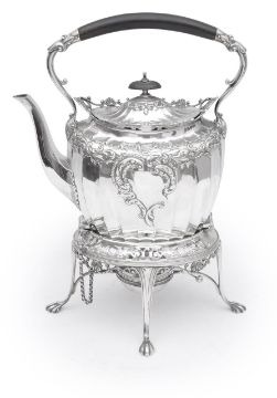 A late Victorian silver spirit kettle on stand with burner