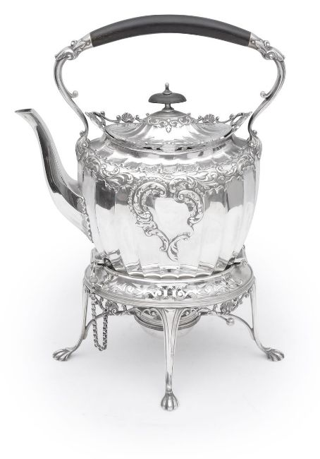 of fluted design embossed with C scroll framed reserves and scrolling foliated borders, initialled, with hinged domed cover, ebonised handle and knop finial, the base with scroll supports and burner