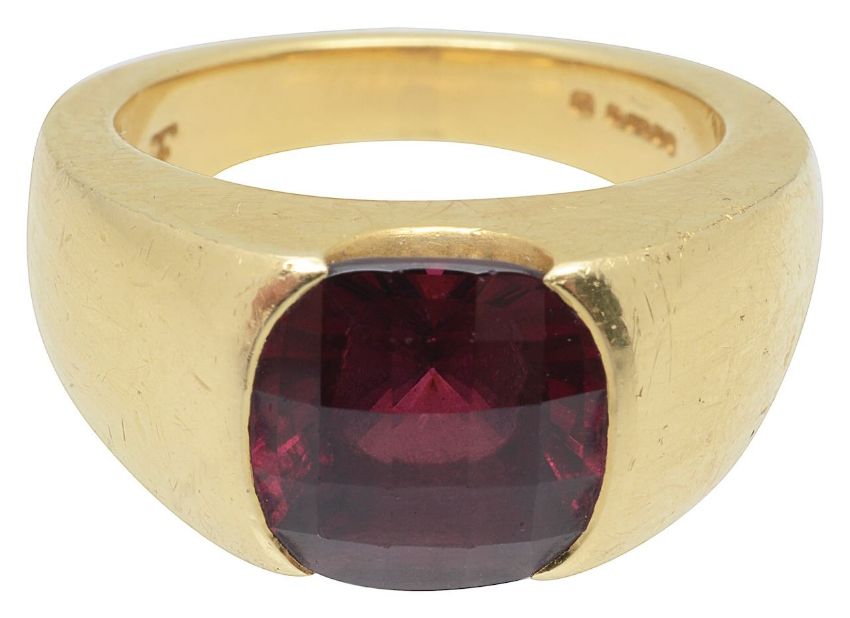with a chequer board cushion cut garnet end set to a plain raised solid gold band hallmark 18ct.