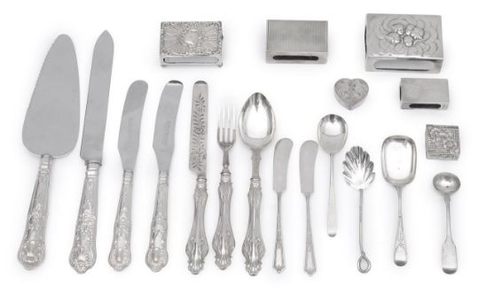comprising a late Victorian embossed matchbox holder, Birmingham, 1898, William Harrison Walter, a larger matchbox cover embossed with winged cherubs masks and clouds, Birmingham, 1907 Levi & Salaman, two engine turned matchbox holders, both engraved with initials, a heart shaped pill box with twin hinged compartments and a small square foliate embossed pill box, both with London import marks, a pair of butter knives, a Victorian knife, fork and spoon christening set with filled acanthus leaf moulded handles and bright cut engraving, modern Kings pattern cake slice, knife and pair of butter spreaders with filled handles and stainless steel blades etc., (qty)