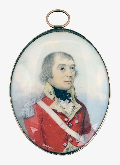 Attributed to Frederick Buck of Cork (Irish, 1771-1840)a double sided portrait miniature of an Infantry officer and a lady, the officer facing right wearing a red coat with cream facings, silver epaulettes, white sash and frilled chemise, the lady facing right with long curled and powdered hair, wearing a bonnet and white dress dress with blue ribbons, watercolour on ivory, oval, gold frame with chased decoration6.2 x 4.8cmCondition: Good condition Irish family collection and thence by descent IMPORTANT NOTEThis item has been registered as exempt from the UK Ivory Act 2018. Ivory declaration submission number reference: YHLLHJRN
