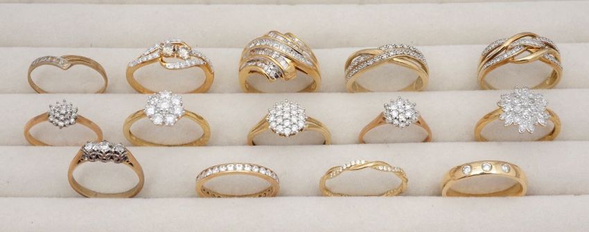 featuring five diamond cluster rings, a three stone ring, a three stone wedding band, a crossover ring with two claw set mink coloured diamonds with grain set wire work and six other.(14)