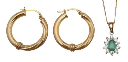 A 9ct emerald drop pendant and a pair of 9ct earrings