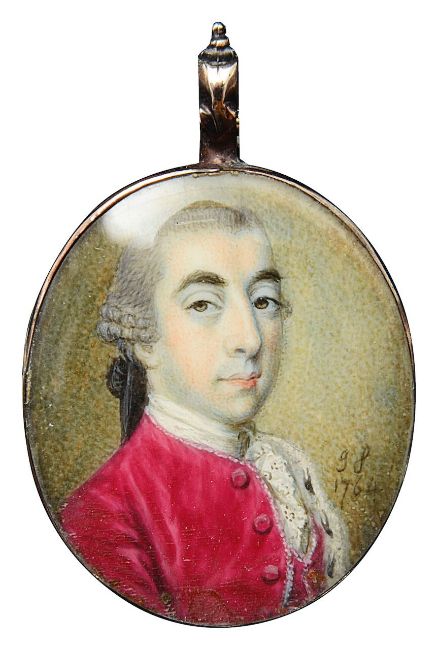 Portrait miniature of a gentleman facing right, wearing crimson jacket, stock and frilled chemise, watercolour on ivory, signed J S 1764, glazed oval silver gilt locket frame