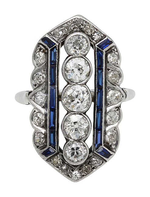 A diamond and sapphire Art Deco long panel ring