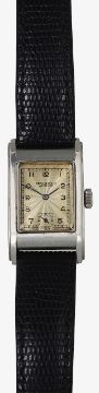 engine turned dial with Arabic numerals, subsidiary dial in an Art Deco rectangular style case, number 65419,