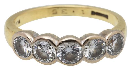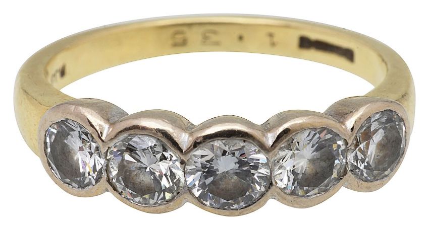 with 18ct hallmark and 1.35 stamp to band, five brilliant cut diamonds, with centre stone slightly larger, bezel set to a plain yellow gold band.