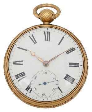 A George IV Robert Roskell of Liverpool 18ct gold open faced key wound pocket watchcase marked Chester, 1829 Timothy Ellison & Henry Fishwickthe enamel dial with Roman numerals, minute track and subsidiary seconds, gilt hands, with fusee movement numbered 28880, engine turned caseback, with rope twist to edge, and suspension ringtotal weight 153gCondition: One of the hands slightly bent. Dial with very slight crack near number 4. Movement not tested or guaranteed.