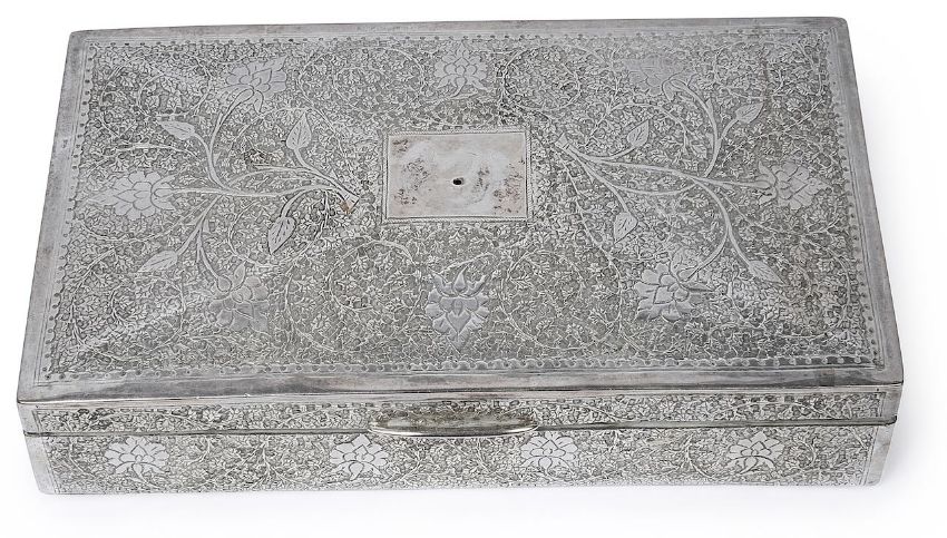 rectangular with hinged domed lid with vacant reserve, all over scrolling chased decoration, cedar lined interior with division