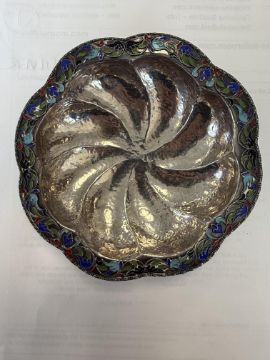 A collection of silver to include a Russian silver and cloisonné enamel bonbon dish