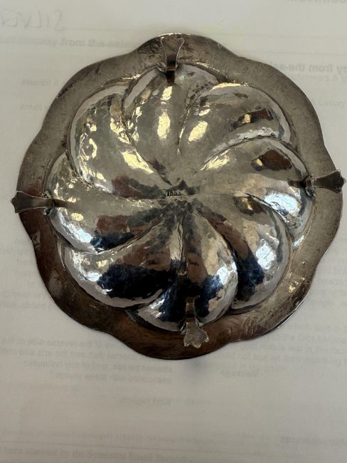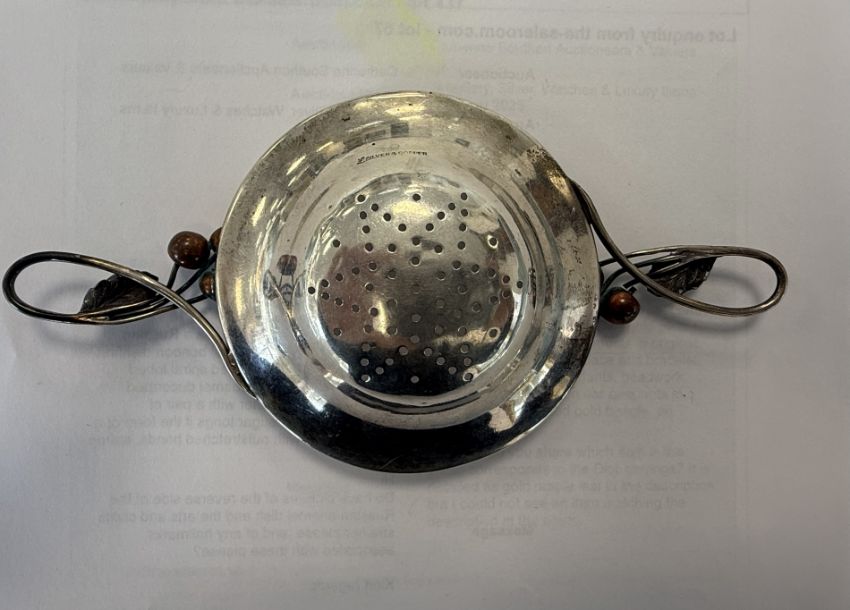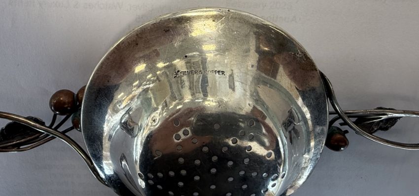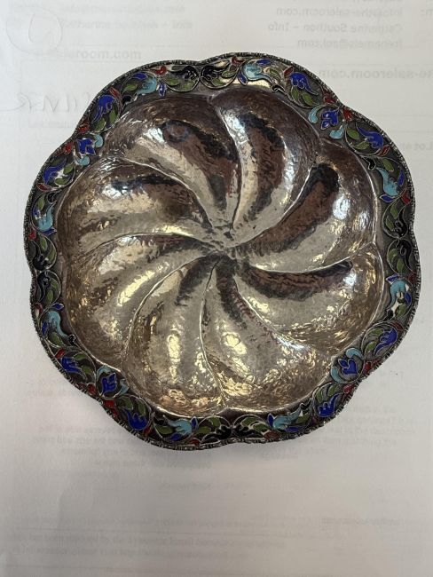 first stamped 1000, of planished spiral lobed design with cloisonné enamel decorated border, on feet together with a pair of American novelty sugar tongs if the form of a running priest with outstretched hands, stamped sterling, a Tiffany & Co. serving spoon, a Danish silver-gilt and red enamel serving slice stamped A Michelsen Copenhagen, a silver handled table bell and a silver and copper Arts & Craft tea strainer with sinuous looped stem handles terminating in copper berries, initialled, (6)