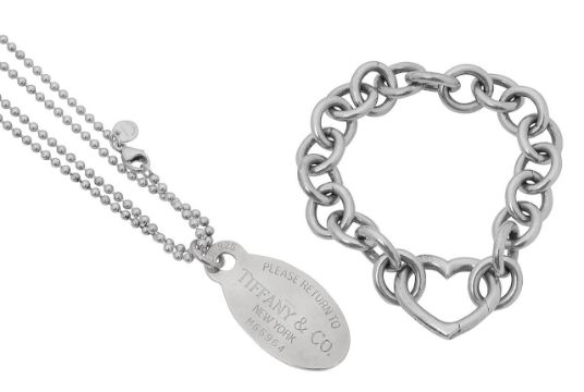 the former with a tag engraved Please Return to Tiffany & Co. New York M65964 and a 16 inch chain marked 750, together with a heavy link bracelet with heart catch, in pouch (2)
