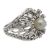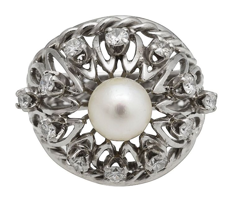 featuring hand-pierced wire-work 'leaf frame set centrally with a single pearl surrounded by ten round 'old style' brilliant cut diamonds mounted to a four claw setting with a single diamond set to each shoulder, rope and wire-work border to domed head and stamp PT 950 to band.