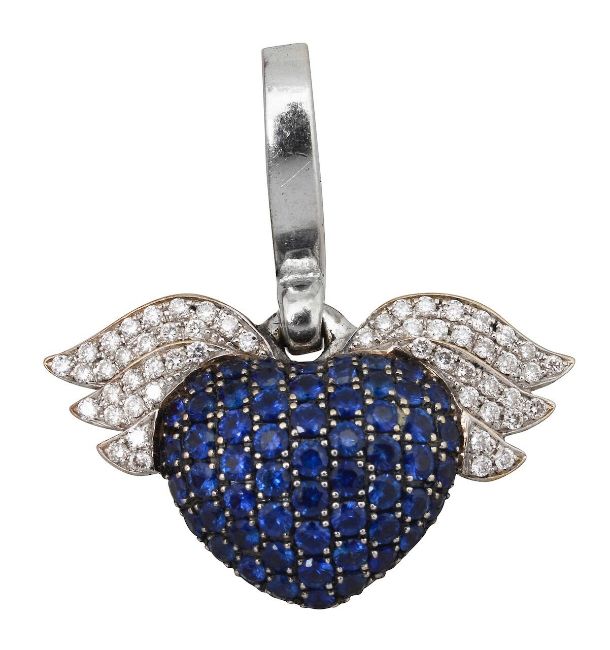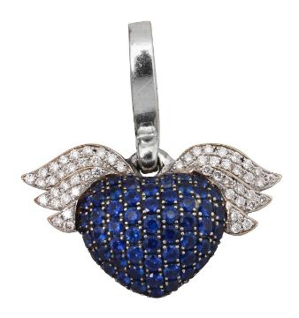 An 18ct white gold and blue sapphire Theo Fennell winged heart charm