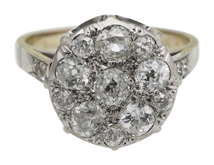 comprising of a high round panel, grain set with eleven old cut diamonds set to a hand pierced collet, mounted on a plain, raised band, with two diamond set to each side of the head.
