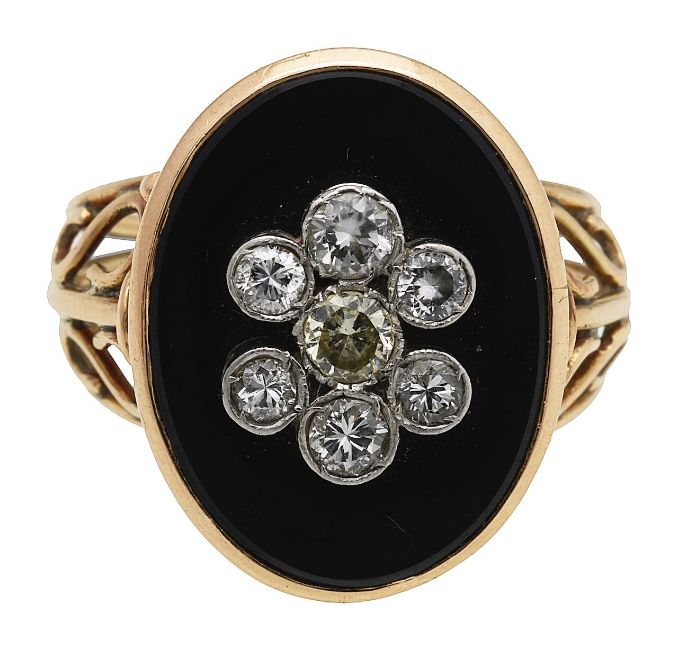 with seven diamonds each grain set in bezel mount to a flat oval onyx stone, held in a bezel setting to a fancy wire-work gallery and band.