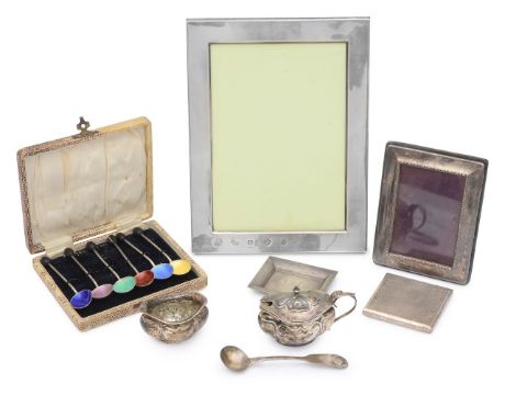 to include a rectangular easel back photograph frame with feature hallmarks, Sheffield, 2001, Mappin & Webb, a smaller photograph frame, A Tiffany & Co. rectangular pin tray engraved C & E 1974 an engine turned Kigu, powder compact, a cased set of coffee spoons with harlequin guilloche enamel bowls and bean terminals, etc., (qty)