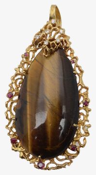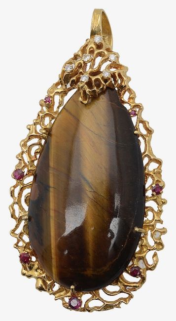 A large 18ct gold diamond and ruby 70s tigers eye pendant