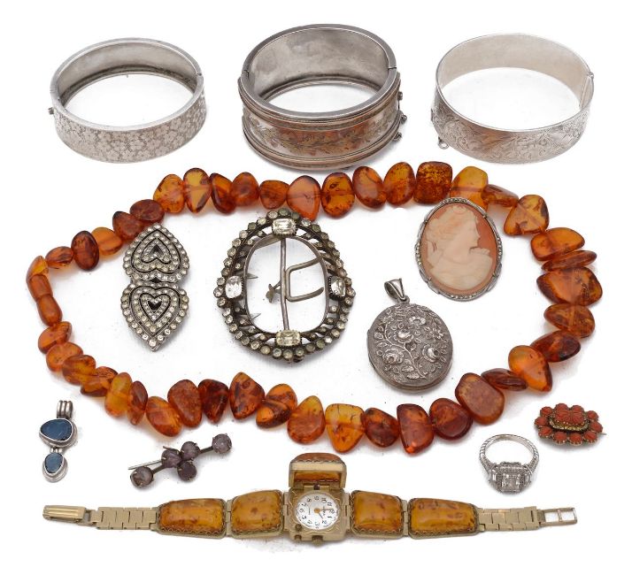 first tests as gold, together with a Victorian silver and gilt hinged cuff bangle decorated with a raised banded of thistles, a Victorian foliate engraved cuff bangle and another later of similar design, a paste set heart shaped duet clip, a Victorian oval locket chased with roses, an early 19th century silver and white paste shoe buckle unmarked, adapted as a brooch, a Russian amber and gilt metal panel bracelet watch with concealed dial, graduated polished amber nugget necklace (qty)