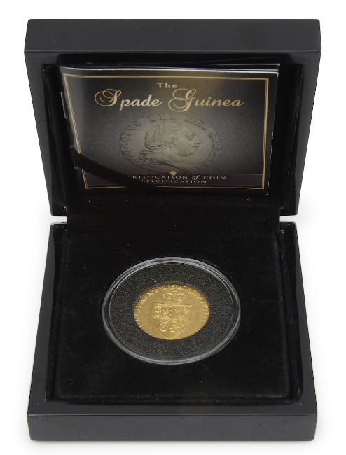 obverse; portrait of King George III by Lewis Pingo - only ever used on the 'Spade' series, reverse; flat topped spade shield of the Royal Arms, in capsule & box with certification of ownership & statement of authenticity; The Bradford Exchange, issuing authority; The Royal Mint, UK